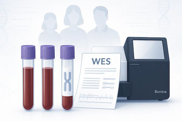 Секвенирование экзома - определение структуры кодирующих участков (всех генов) всех генов. В исследование включены как клинически значимые, так и все остальные гены человека. Термином "ТРИО" в генетике обозначают отца, мать и ребенка. Проведение полноэкзомного секвенирования ТРИО повышает его эффективность, по сравнению с аналогичным исследованием, проведенным только пробанду. Такой подход позволяет правильно классифицировать ранее не описанные варианты, варианты в генах кандидатах и значительно сокращает время постановки точного диагноза. Кроме того, проведение полноэкзомного секвенирования трио позволяет определить у родителей носительство патогенных мутаций, связанных с аутосомно-рецессивными заболеваниями и болезнями с поздним началом.